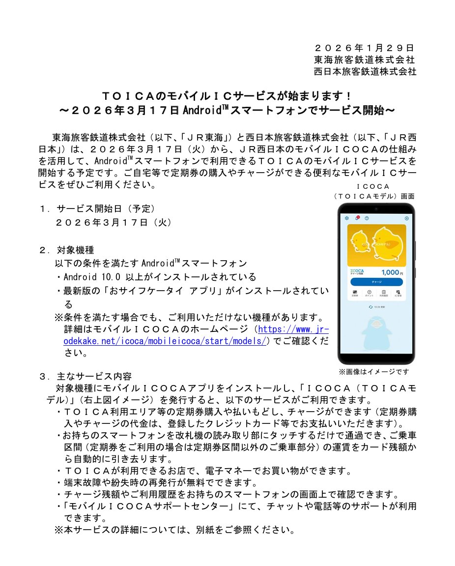 @rappakun2"JR東海とJR西日本、「TOICA」のモバイルICサービス開始" l.smartnews.com/m-74vQA7eg/thn…