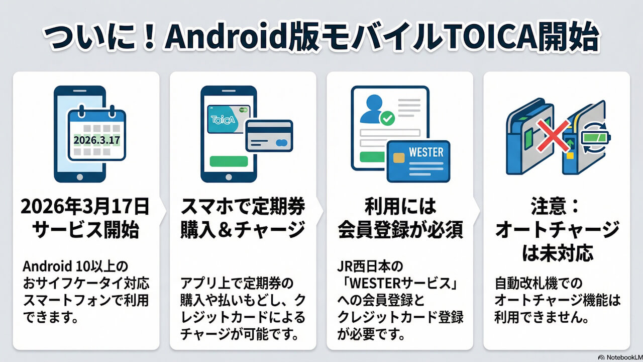 TOICAのモバイルICサービスがついに始まりましたね!これにより、JR東海とJR西日本の沿線利用者にとって、より便利でスムーズな移動が実現します。特に、ピッとスマホをかざすだけで改札を通れる便利さは、多くの方々に喜ばれていることでしょう。今後のiOS版の登場にも期待が高まります。